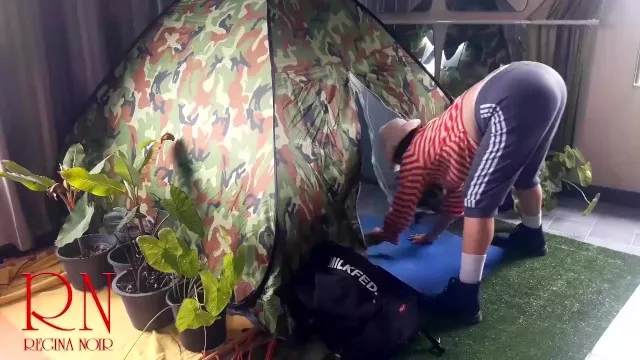 Sex in camp. A stranger fucks a nudist lady in her mouth in a camping in nature.